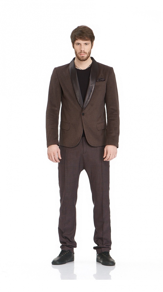 Brązowa marynarka jednorzędowa z szalowym kołnierzem.
