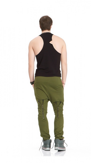 Wygodne, zielone spodnie z dzianiny bawełnianej. Obniżony krok. Regulowane ozdobne zamki na tylnych panelach. Elastyczna guma