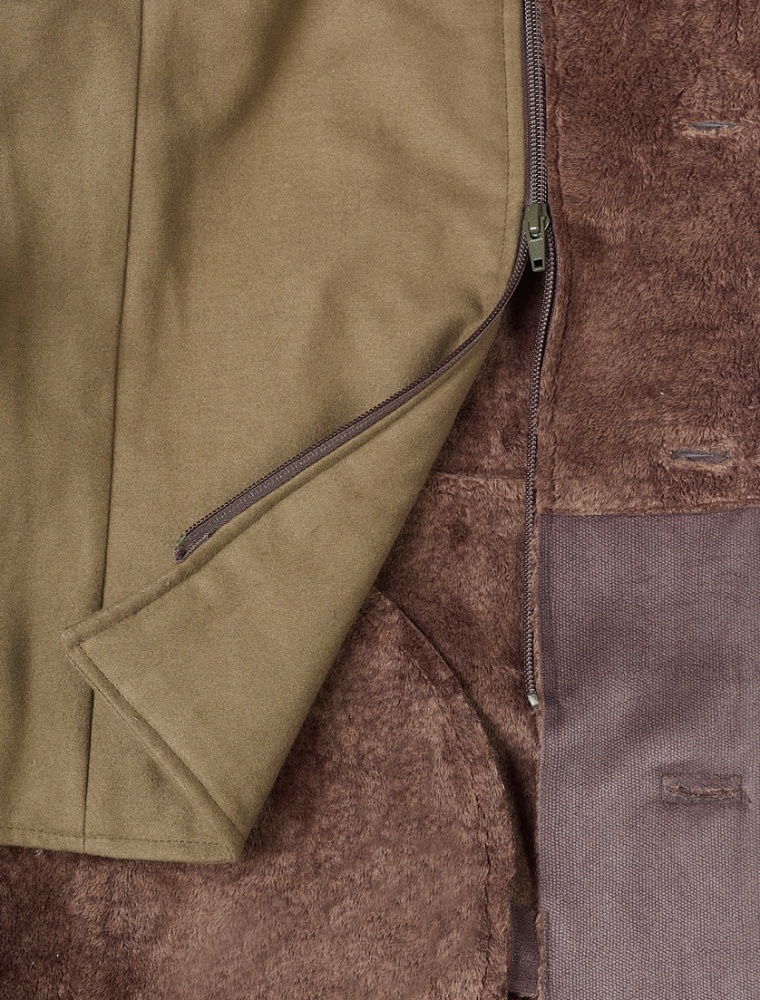 Brązowy kożuch z ekologicznej skóry, tworzący luksusowy, a jednocześnie współczesny styl. Odsuwana na zamek podpinka umożliwia noszenie w różnych warunkach pogodowych.