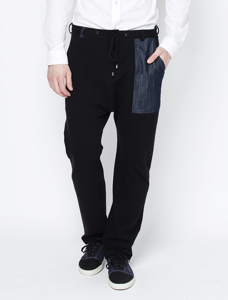 Bawełniane spodnie z czarnej dzianiny. Materiał zapewnia funkcjonalność i wygodę noszenia, a klasyczny krój tworzy look w trendzie sport luxe. Wykończone szlufkami i sznurkiem z metalowymi końcówkami. Dwie kieszenie z przodu i z tyłu - lewa kieszeń z denimu.