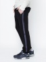 Wygodne bawełniane dzianinowe spodnie z lampasami z niebieskiej dzianinowej ekoskórki. Lekko obniżony krok. Pas i mankiety z czarnego ściągacza. Szwy stębnowane z przodu i z tyłu. Pas na gumę i regulowany sznurek. Dwie boczne kieszenie na czarny zamek.